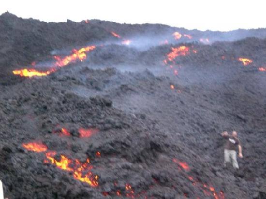 Csodálkoztam, hogy amikor megérkeztünk, akkor egyből sietve nekivágtunk a túrának, ami körülbelül kétórányi vulkánmenetet jelentett. Annyit mondott a vezetőnk biztatásképpen, hogy lehet, hogy sötétben fogunk lejönni a hegyről, de így legalább jobban láthatjuk a lávafolyásokat. Közel két évvel korábban Hawaiion láttam már lávafolyást, de azt is több kilóméternyi távolságból. Most is erre számítottam, hogy felmegyünk egy csúcsra és majd onnan átnézünk a szomszédos aktív vulkánra, aztán jól van, lehet visszabattyogni a kisbuszunkhoz.